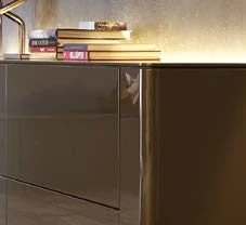 Die gerundeten Elementabschlüsse der Lowboards können gegen Aufpreis wahlweise mit Auszügen oder Drehtüren ausgestattet werden. Bei den Drehtüren muss der seitliche Abstand 27 cm (je Tür) betragen, um die Türen vollständig öffnen zu können.