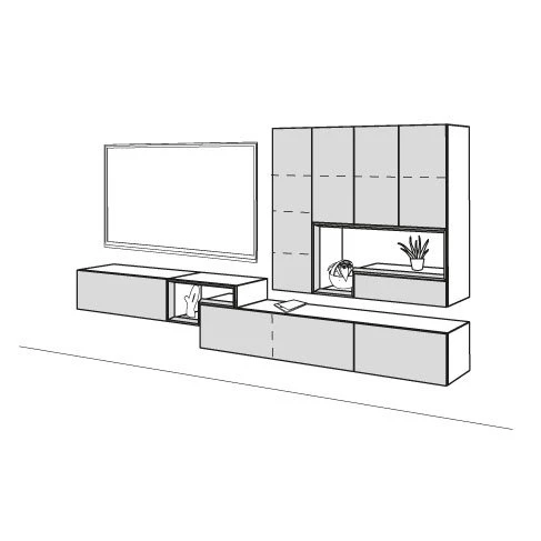 Die hülsta Tetrim Wohnwand 5 besteht aus 2 Lowboards, einem offenen Fach und zwei Hängeelementen mit einem offenen Fach.