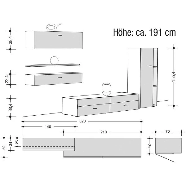 Gesamt: 191 x 390 x 52 cm (H x B x T)