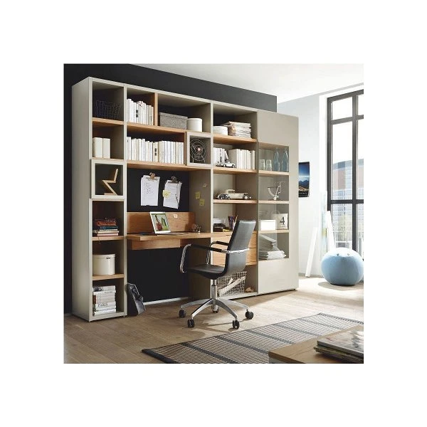 Die now! time by hülsta Kombination 12 in Natureiche/Lack-seidengrau ist eine Wohnwand mit offenen Fächern, einer Vitrine und einem Schreibplatz.