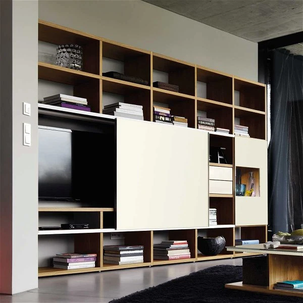 Die now! time by hülsta Kombination 14 in Natureiche/Lack-weiß verfügt über Regale mit offenen Fächern, eine Schiebetür hinter der sich der Fernseher verbergen lässt, einen Schrank mit Tür inklusive Klarglasausschnitt sowie Schubladen. Wenn Ihre Möbel Ihre etwas anderen Ideen möglich machen sollen dann sind Sie bei now! time genau richtig.