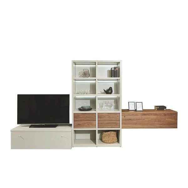 Die now! time by hülsta Kombination 6 in Kernnussbaum/Lack-seidengrau besteht aus einem Regal, einem Lowboard und einem Hängeelement.