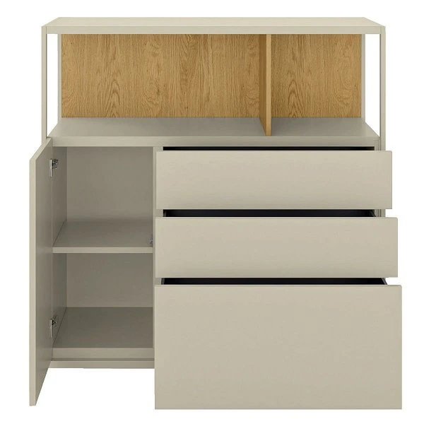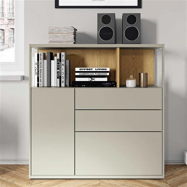 Das now! vision by hülsta Einzelmöbel 6R 1 Tür in Lack-seidengrau/Natureiche verfügt über eine Tür, drei Schubladen und offenem Fach mit Rückwand und Mittelseite. Die now! Vision by hülsta Möbel fahren eine klare Linie und sind doch überaus wandelbar. Die Oberflächen variieren von klassischen Lack- und Hochglanzlack-Fronten über Akzentausführungen bis hin zu hochwertigen Furnieren.