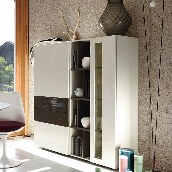 Die now! vision by hülsta Kombination 10 in Lack-weiß/Lack-Hochglanz-grau/Lack-Hochglanz-weiß/Lack-grau verfügt über offene Fächer, zwei Türen und drei Schubladen. Die now! Vision by hülsta Möbel fahren eine klare Linie und sind doch überaus wandelbar. Die Oberflächen variieren von klassischen Lack- und Hochglanzlack-Fronten über Akzentausführungen bis hin zu hochwertigen Furnieren.