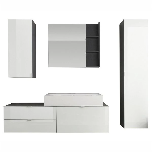 - bestehend aus Hänge-Waschbeckenunterschrank, Wandspiegel mit Ablage, Hänge-Hochschrank mit Innenspiegel, Hängeschrank mit Innenspiegel und Mineralguss-Aufsatzwaschbecken