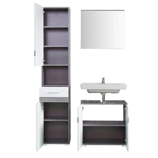 Die nassraumgeeignete trendteam Set-One Bad Kombination punktet nicht nur mit ihrer stylishen Aufmachung, sondern offeriert Ihnen zugleich auch extra Stauraum in Ihrem Badezimmer. Eine einzigartige Beständigkeit wird durch den Einsatz von Dekorfolie sowie Melamin garantiert. Das Design kennzeichnet der rauchsilberfarbene Korpus im Sardegna Dekor in Kombination mit der weißen Front in dekorativer Hochglanz Tiefzieh Optik. Silberfarbene Griffe ordnen sich farblich ideal in das Dekor ein. Der Artikel lässt sich bestens mit zusätzlichen Möbeln des Sets kombinieren.