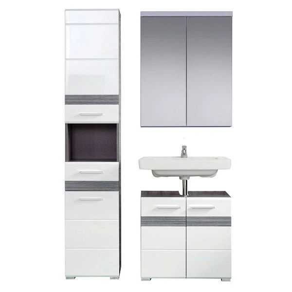 Die nassraumgeeignete trendteam Set-One Bad Kombination punktet nicht nur mit ihrer stylishen Aufmachung, sondern offeriert Ihnen zugleich auch extra Stauraum in Ihrem Badezimmer. Eine einzigartige Beständigkeit wird durch den Einsatz von Dekorfolie sowie Melamin garantiert. Das Design kennzeichnet der rauchsilberfarbene Korpus im Sardegna Dekor in Kombination mit der weißen Front in dekorativer Hochglanz Tiefzieh Optik. Silberfarbene Griffe ordnen sich farblich ideal in das Dekor ein. Der Artikel lässt sich bestens mit zusätzlichen Möbeln des Sets kombinieren.
