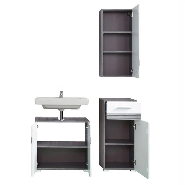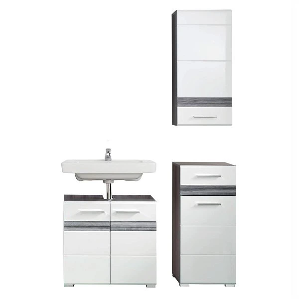 Die nassraumgeeignete trendteam Set-One Bad Kombination punktet nicht nur mit ihrer stylishen Aufmachung, sondern offeriert Ihnen zugleich auch extra Stauraum in Ihrem Badezimmer. Eine einzigartige Beständigkeit wird durch den Einsatz von Dekorfolie sowie Melamin garantiert. Das Design kennzeichnet der rauchsilberfarbene Korpus im Sardegna Dekor in Kombination mit der weißen Front in dekorativer Hochglanz Tiefzieh Optik. Silberfarbene Griffe ordnen sich farblich ideal in das Dekor ein. Der Artikel lässt sich bestens mit zusätzlichen Möbeln des Sets kombinieren.